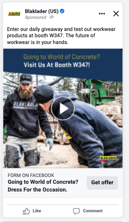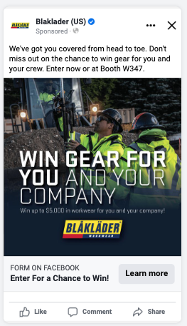 True launched an advertising campaign on Facebook and Instagram the week leading up to the event. True utilized geotargeting to best reach the intended audience of the World of Concrete trade show. Part of the ad campaign included a contest for daily prizes that encouraged tradeshow attendees to visit the Blaklader booth. After the trade show, True developed an email campaign to follow up with leads from the show.