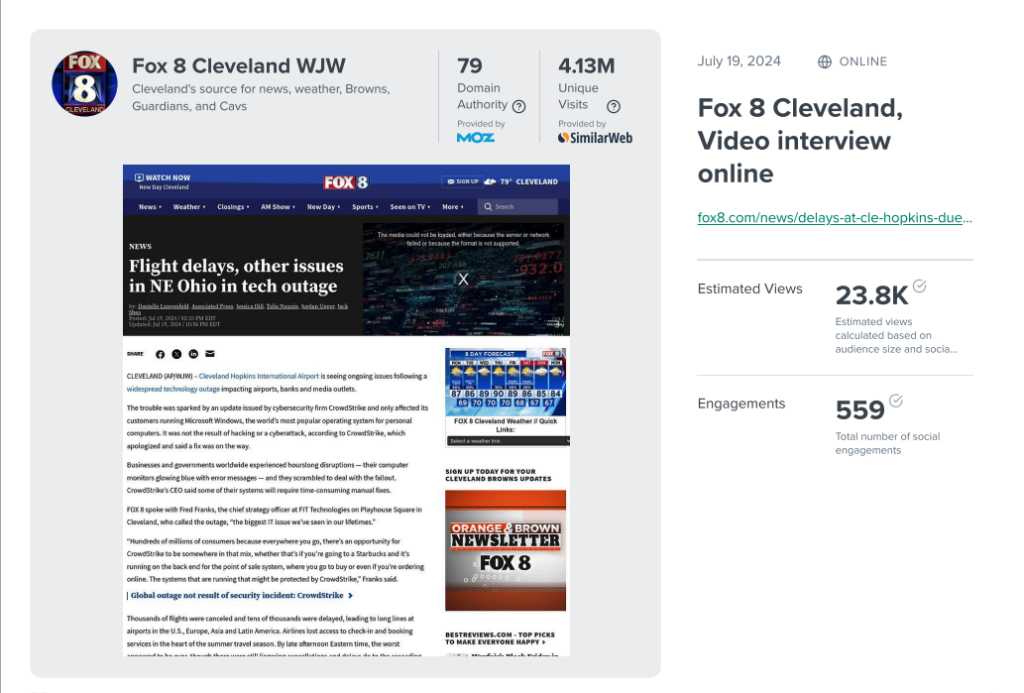 When the CrowdStrike outage disrupted life in July of 2024, True assisted FIT Technologies with leveraging media and PR strategies to position themselves as a trusted authority. By working with local media outlets and displaying their expertise, millions of viewers learned critical information—and heard the FIT name.
